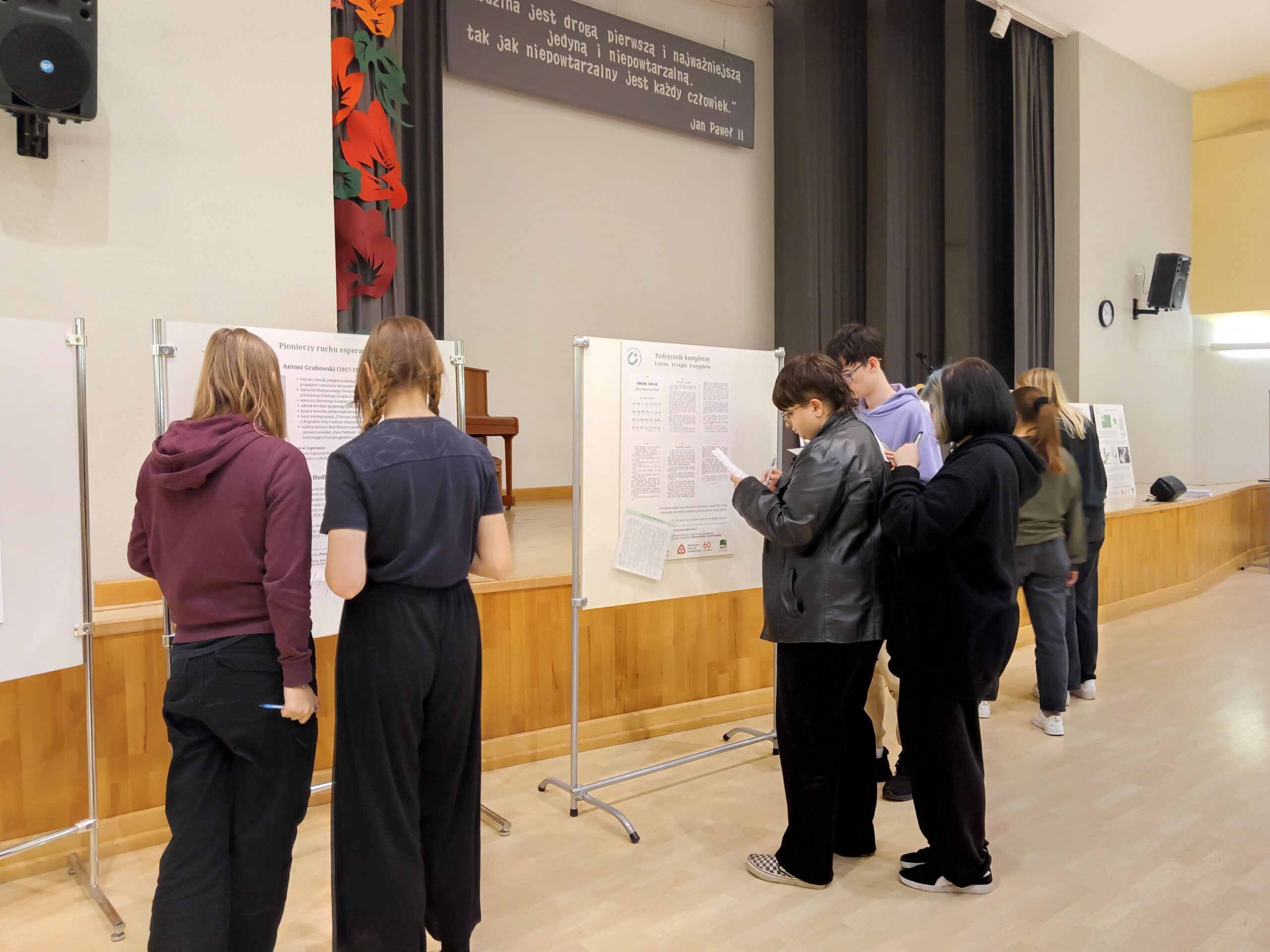 6.10.2023 roku odbyło się nasze kolejne spotkanie w ramach projektu “Poznaj moc Esperanta!” Tym razem odwiedziliśmy Zespół Szkół nr 5 w Lublinie. Zaczęliśmy od prelekcji pokazującej jak Esperanto powstało, jak wygląda teraz oraz jakie ma znaczenie w budowaniu niematerialnego dziedzictwa kulturowego. Następnie uczniowie zaznajomili się z naszą wystawą o historii i kulturze ruchu esperanckiego.